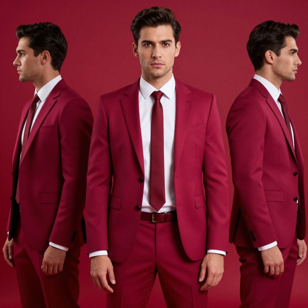 In this striking image, a man stands confidently in a vibrant reddish magenta suit, his attire accentuated by a crisp white shirt and a neatly tied tie. The suit, with its tailored fit and structured lapels, is complemented by a matching belt and trousers. The man's hair is neatly styled, adding to his polished appearance. Mirrored images of him create a symmetrical effect, enhancing the visual impact. The background is a solid magenta red, matching the suit's color, which creates a harmonious and cohesive look. The overall composition is balanced, with the man centrally positioned, and the mirrored images flanking him, creating a sense of depth and dimension. The image exudes a sense of sophistication and elegance, with the use of high-contrast colors and precise detailing.