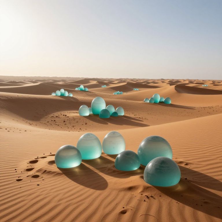 Whispering glass dunes stretch across a vast desert landscape, their translucent teal forms scattered and clustered in patterns that evoke the collective memory of ancient civilizations, under a serene sky where the sun casts soft shadows.