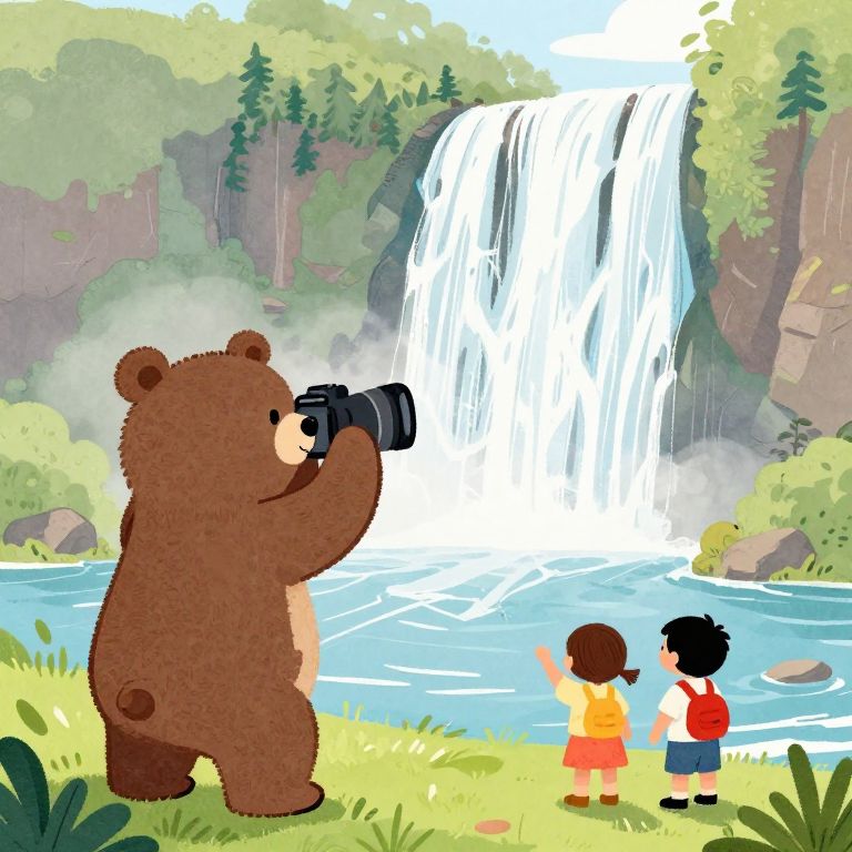 Camera Obscura Benny the bear catching a glimpse of a breathtaking waterfall, kids book illustration, simple, watercolor, colorful,