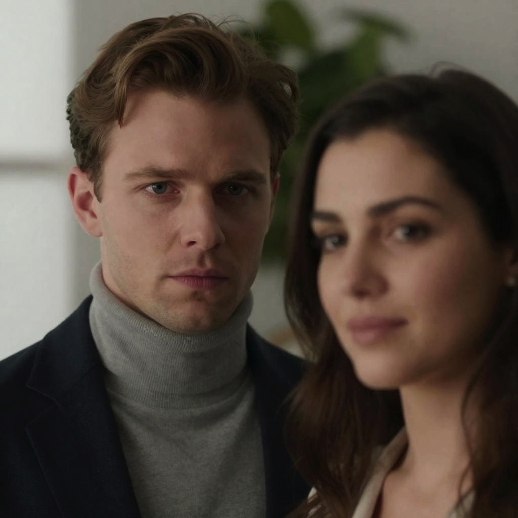 Black-and-white photograph of a man and woman. Man with short, slicked-back hair, serious expression, leans closely to woman. Woman with dark, wavy hair, fur-lined coat, bow headband, soft smile, gazes slightly to the right. Man's head rests on woman's shoulder. Background blurred, dark.