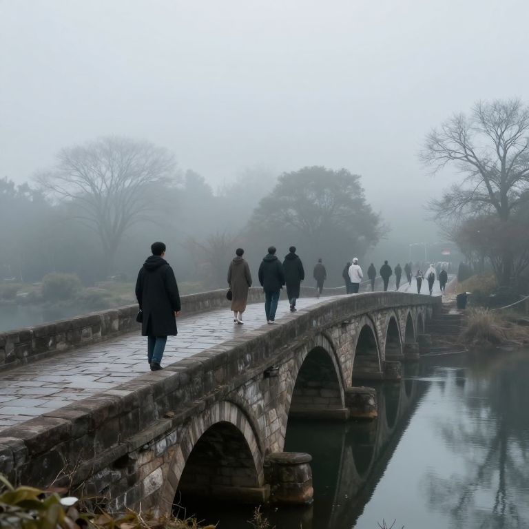Serenity whispers through the misty air as travelers stand upon a bridge of stone, their steps echoing with the weight of memories, while the river below mirrors the quiet introspection of souls lost in the embrace of time.