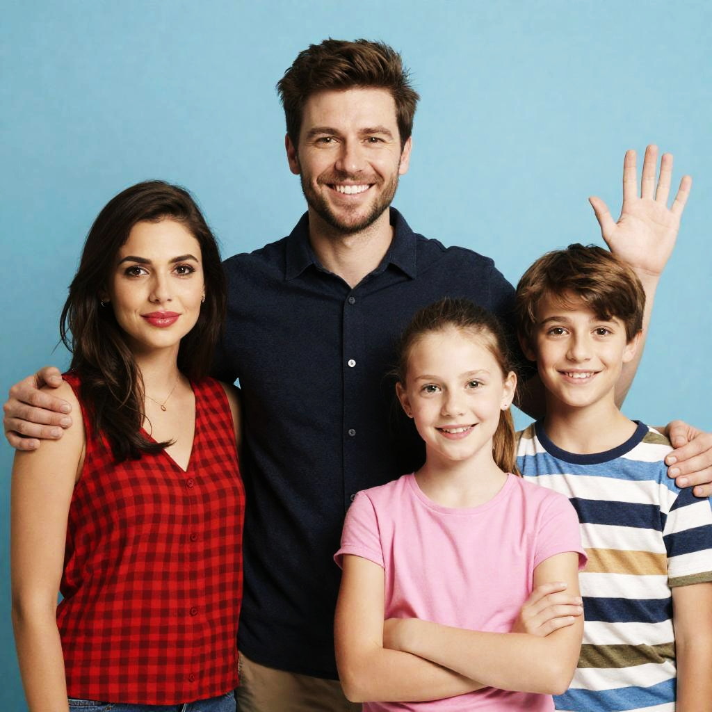 Photograph of four people against a blue background. Man in dark shirt, smiling, center. Woman in red checkered sleeveless top, left. Girl in pink shirt, arms crossed, right. Boy in striped shirt, waving, right. Man's arm around woman's shoulder.