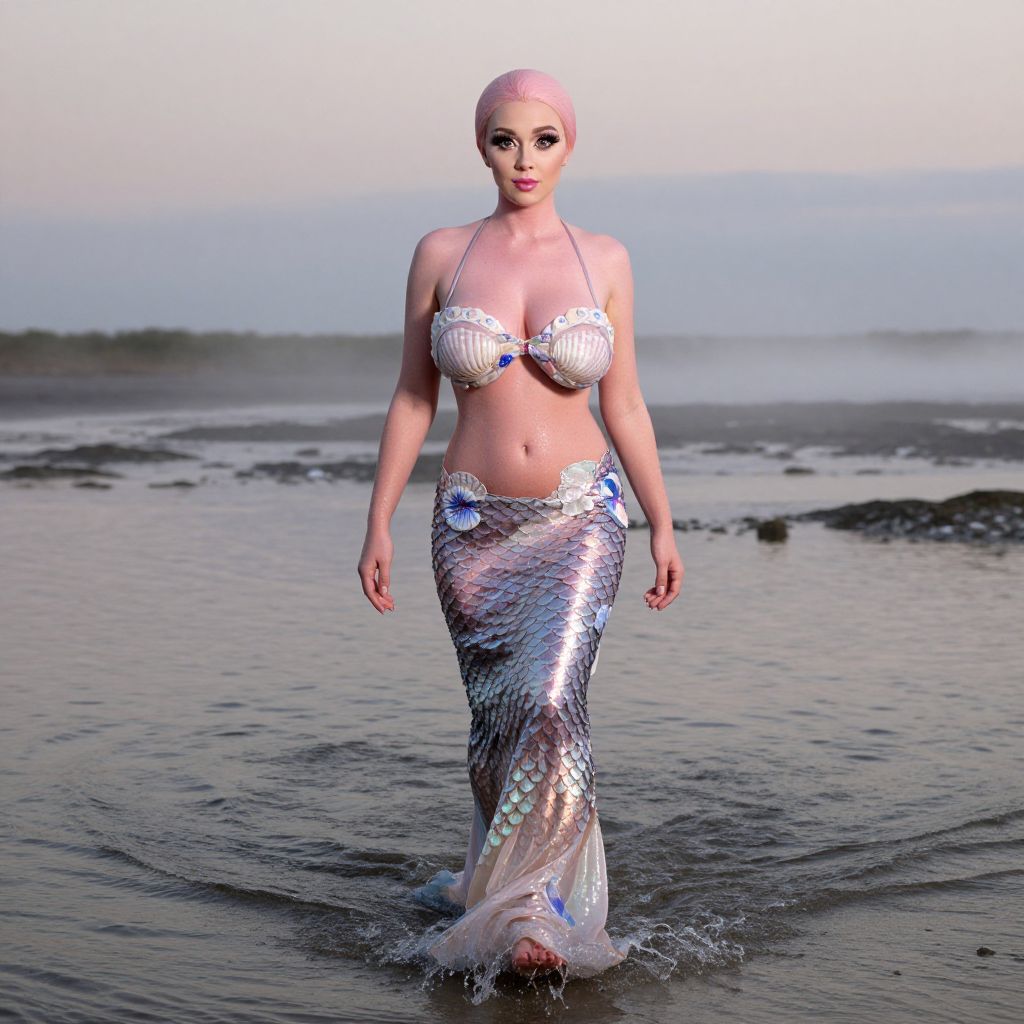 A graceful woman with smooth pink skin and large, expressive eyes, wearing a detailed mermaid costume of shimmering scale fabric and seashell embroidery, walking through a tidal marsh at dawn, her long flowing gown reflecting the soft morning light, water mist rising around her, cinematic natural lighting, realistic portrait photography. The woman has big tits and cute face