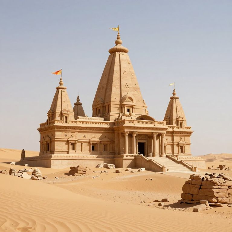 A majestic, otherworldly temple emerges from the sands of a desolate desert, its grand architecture seamlessly blending with crumbling ruins, while flags flutter atop its pyramidal spires in defiance of the barren landscape.