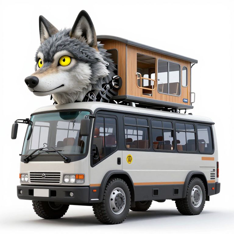 Animal - transformer hybrid of bus and wolf, having cabin in form of wolf head with big yellow eyes and long mechanical body - it is bus with wheels and windows, standing