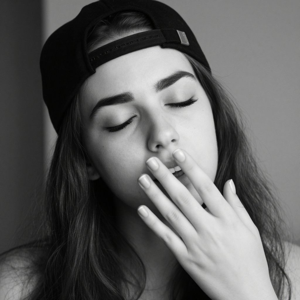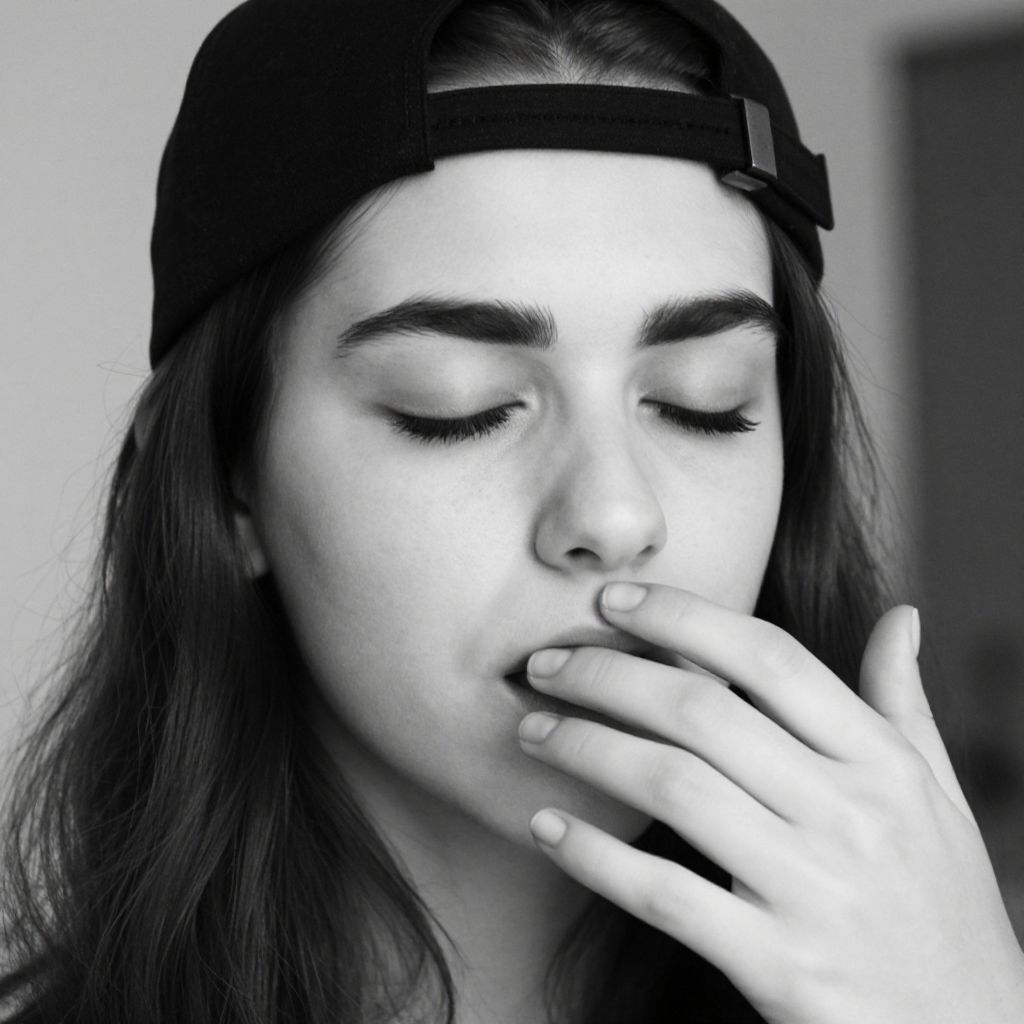 Black and white photo of a young woman with long dark hair and thick eyebrows. She's wearing a backward black cap and has her eyes closed, resting her hand near her mouth. Her fingers are slightly spread, and her expression is relaxed. The background is blurred, focusing attention on her face. The overall vibe is cool and introspective.
