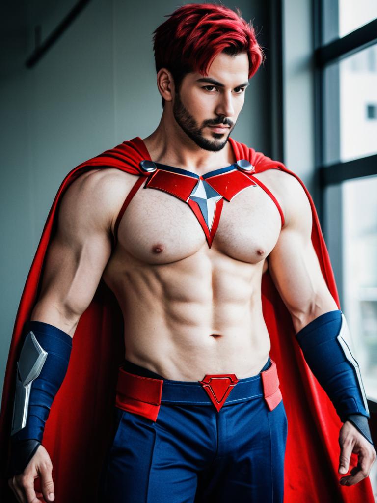 Photo-realistic portrait of a muscular man with red gradient hair and a goatee wearing an Akashi cosplay superhero costume. The costume features a red cape, black chest straps, and a detailed belt. The subject has distinct facial features including red eyes, thick eyebrows, a scar on the nose, and long sideburns. The photo is taken indoors with natural lighting and shallow depth of field, highlighting the subject's large pectorals and defined abs.