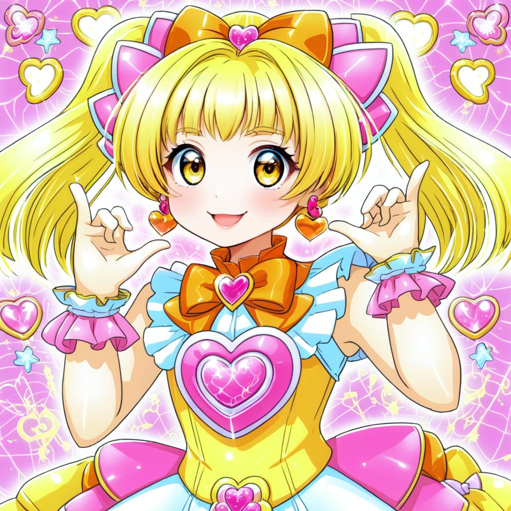 Anime-style illustration of a magical girl character with blonde short hair tied in twin tails, adorned with a heart-shaped hair ornament and a large orange bow. She has bright yellow and brown eyes, wears an orange choker, pink and blue wrist cuffs, a yellow and pink outfit with heart motifs, and is set against a vibrant pink background with floating heart shapes and sparkles.