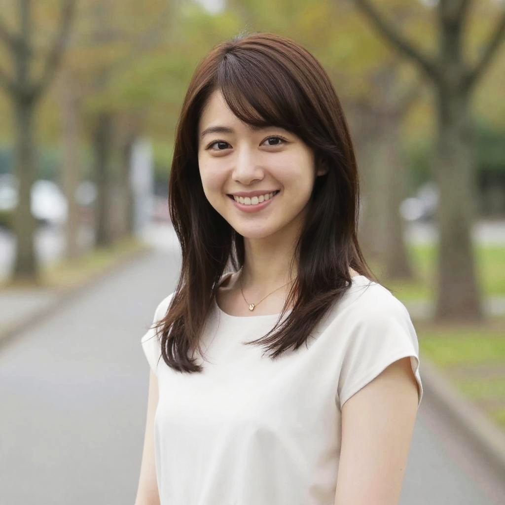 Photograph of an Asian woman with fair skin and long, straight black hair with bangs, wearing an off-shoulder white blouse. She has a soft smile and is centered in the frame, facing the camera. The background is a blurred, elegant, beige stone building with tall windows and a blue-gray roof, flanked by manicured green lawns and a gravel path. The image has a bright, natural light, highlighting the woman's gentle features and the refined architectural setting. The overall atmosphere is serene and sophisticated.