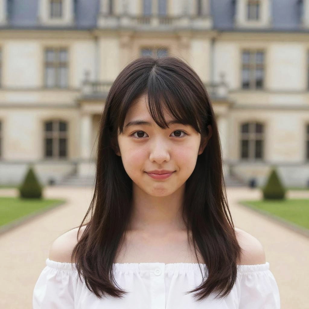 Photograph of a young Asian woman with straight black hair, wearing a white off-shoulder top, standing in front of a grand, blurred European