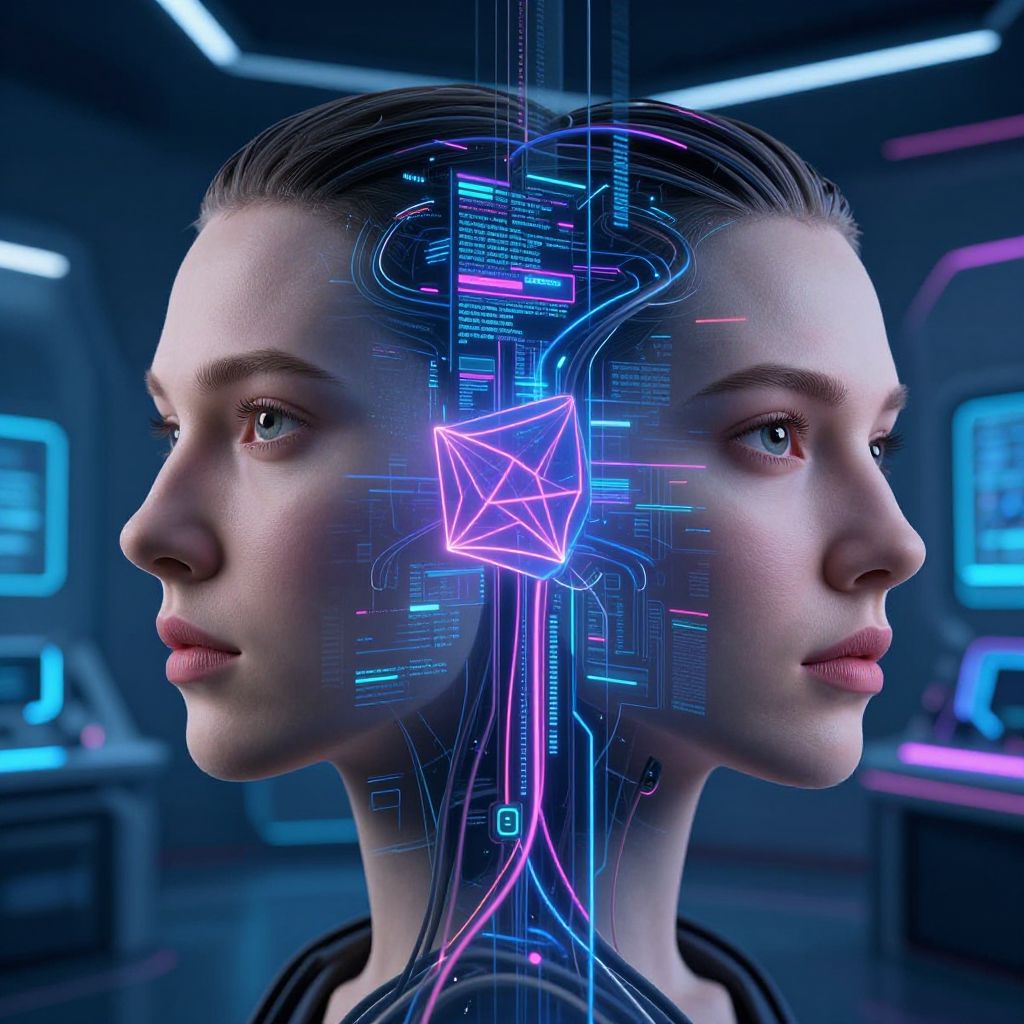 This is a digitally rendered, CGI image featuring a split-profile view of a young woman with fair skin and light brown hair, styled neatly. Her left and right profiles are symmetrically mirrored. A vibrant, glowing neon blue and purple circuit pattern, including a highlighted envelope icon, runs vertically through the center of her face, blending into her hairline and neck. The background is a futuristic, dimly lit room with blue and purple neon lights, and blurred computer monitors. The woman's expression is neutral, and she wears a dark top. The overall style is cyberpunk, with a high-tech, digital aesthetic.