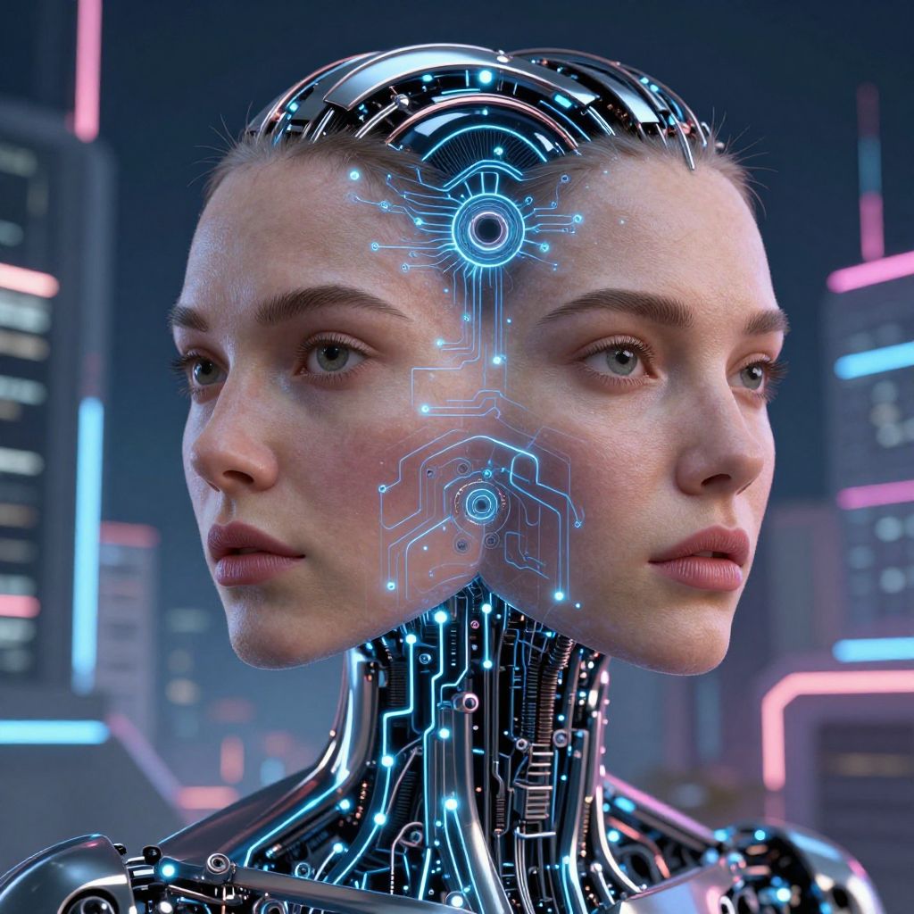 Digital CGI of a woman with fair skin, blue eyes, and sleek brown hair, shown in profile, with neon blue and pink circuitry and a