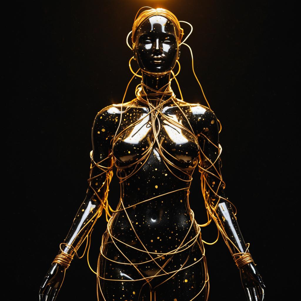 Black female mannequin covered in bright fluorescent paint splatters, with electric purple wires flying wildly in the air, standing against black background with neon blue light, Redshift Render, asymmetrical composition, futuristic aesthetic, highly detailed, 16k super-resolution