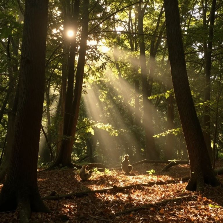 Serenity whispers through the forest as sunlight pierces the canopy, casting golden beams that dance upon the earth, while the gentle rustle of leaves and the faint hum of life compose a symphony of peace and timeless connection.