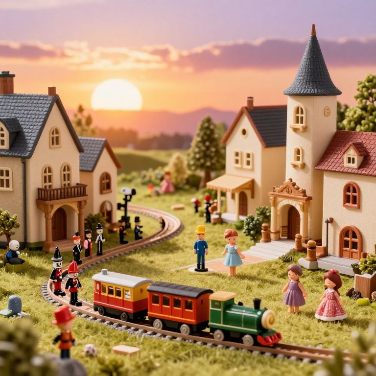 Toyland scene showing a fantastical miniature village made entirely of toys, with toy soldiers, trains, and dolls interacting under a glowing sunset, intricate textures and enchanting lighting, inspired by a storybook illustration style.