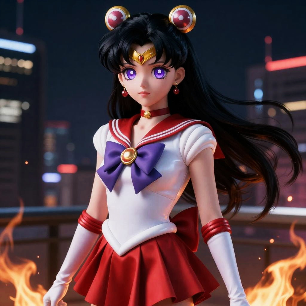 Tiara, sailor senshi uniform, white gloves, red sailor collar, red skirt, star choker, elbow gloves, pleated skirt, bare legs, purple bowspace, (mars_\(planet\)), floating_hair, pointing_to_the_side, leg_up, insane details, intricate details, hyperdetailed, ultra detailed, extreme detailed, highest detailed, high_detail, colorful, beautiful, hdr, photorealistic, highres, ultra_high_res, photography, aesthetic, extremely_delicate, 1girl, solo, wide_shot, (masterpiece:1.3), (best_quality:1.3), (ultra_detailed:1.3), 8k, extremely_clear