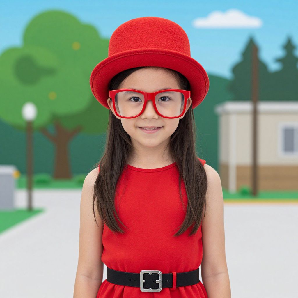 Photograph of a young Asian girl with long black hair, wearing a bright red sleeveless dress with a black belt featuring a silver buckle. She has large, red, square-framed glasses and a matching red, textured hat. She is smiling gently. The background is a colorful, cartoon-like suburban setting with green trees, a white house with brown trim, and a blue sky with white clouds. The image is brightly lit and has a playful, digital art style.