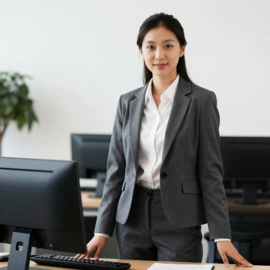 Business Casual Office, woman in business suit standing in an office with a computer