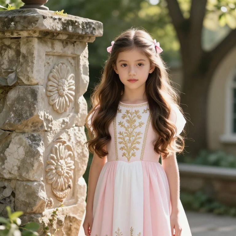 A beautiful girl with long, flowing brown hair and a delicate pink bow tied neatly in her hair, wearing a soft pink and white dress adorned with intricate gold embroidery on the front. She stands confidently in front of a weathered stone wall featuring a detailed floral pattern, sunlight gently filtering through the trees behind her, creating a warm, inviting atmosphere. The scene is set in a peaceful, slightly vintage-style garden, with soft shadows and natural details enhancing the serene mood.