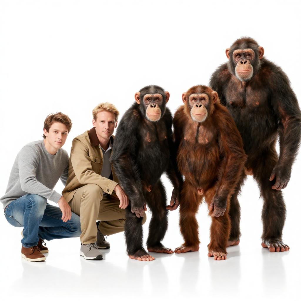 Photograph of five males in a line from left to right. First, a young man with brown hair, gray sweater, blue jeans, and brown shoes crouching. Second, a man with blond hair, tan jacket, khaki pants, and gray shoes crouching. Third, a chimpanzee standing upright. Fourth, an ape with brown fur standing upright. Fifth, a tall, hairy ape standing upright. White background. Reflections on floor.