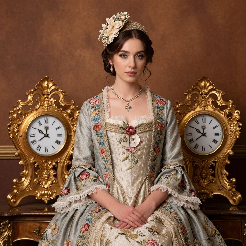 Elegantly seated between two ornate gold clocks, a woman adorned in a vintage-inspired outfit featuring intricate floral embroidery and a matching headpiece exudes timeless sophistication against a richly textured backdrop.