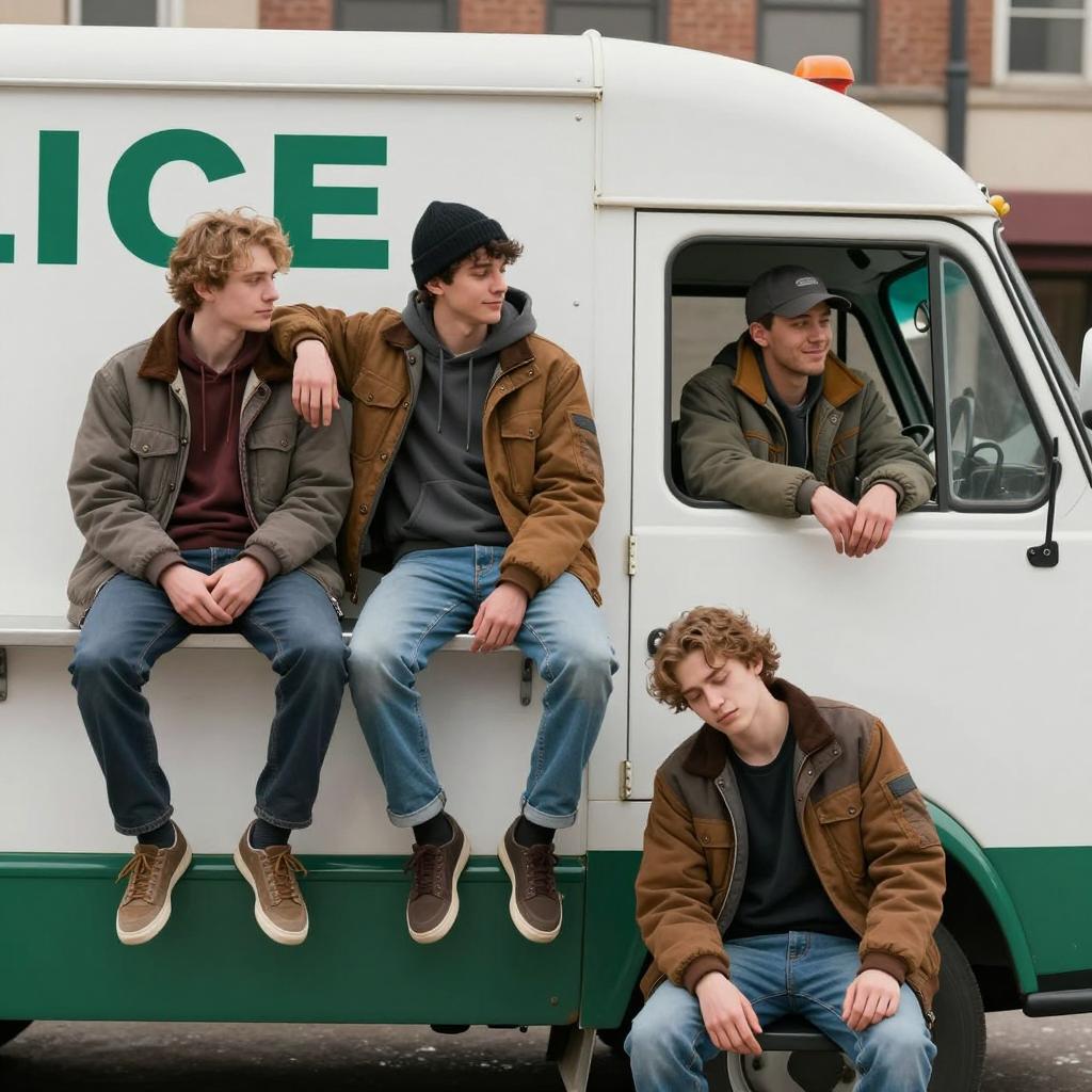 Three people stand and sit on railroad tracks in a grassy, rural area. The central woman with brown hair stands confidently, wearing a blue denim jacket, white T-shirt with red and blue , and dark pants. She has her hands on her hips. The man to her right sits on the track, wearing a dark jacket and jeans, looking down. The man to her left kneels on the track, wearing a light blue shirt and red tie, looking away. Background includes railroad signals, power poles, and a gravel road. All wear blue jeans.