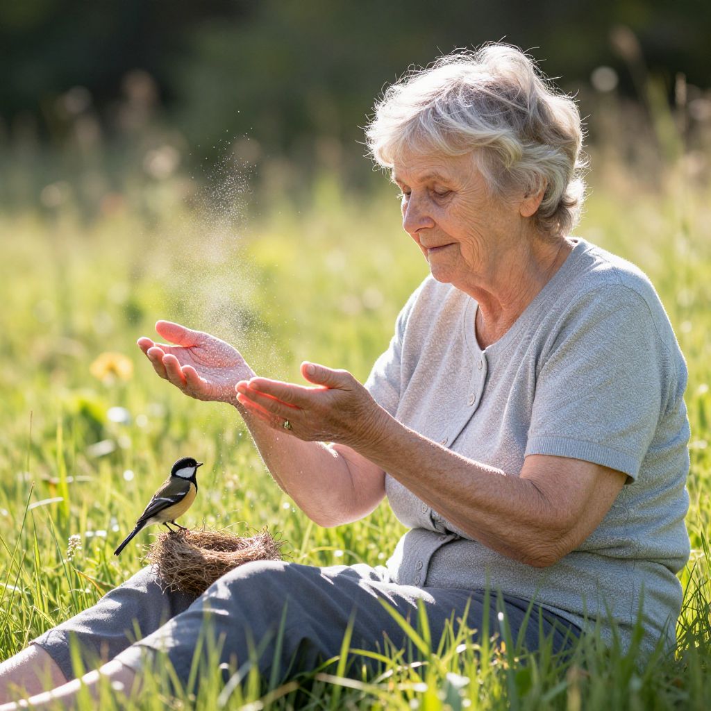 Elderly woman sits serenely in a sunlit meadow, her hands gently releasing sparkling dust as a small bird perches nearby, gathering the shimmering particles for its nest.