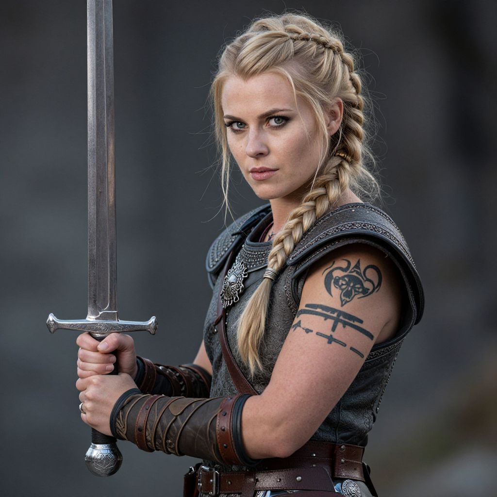 A Viking woman with braided hair and tattoos, wearing armor and carrying a sword.