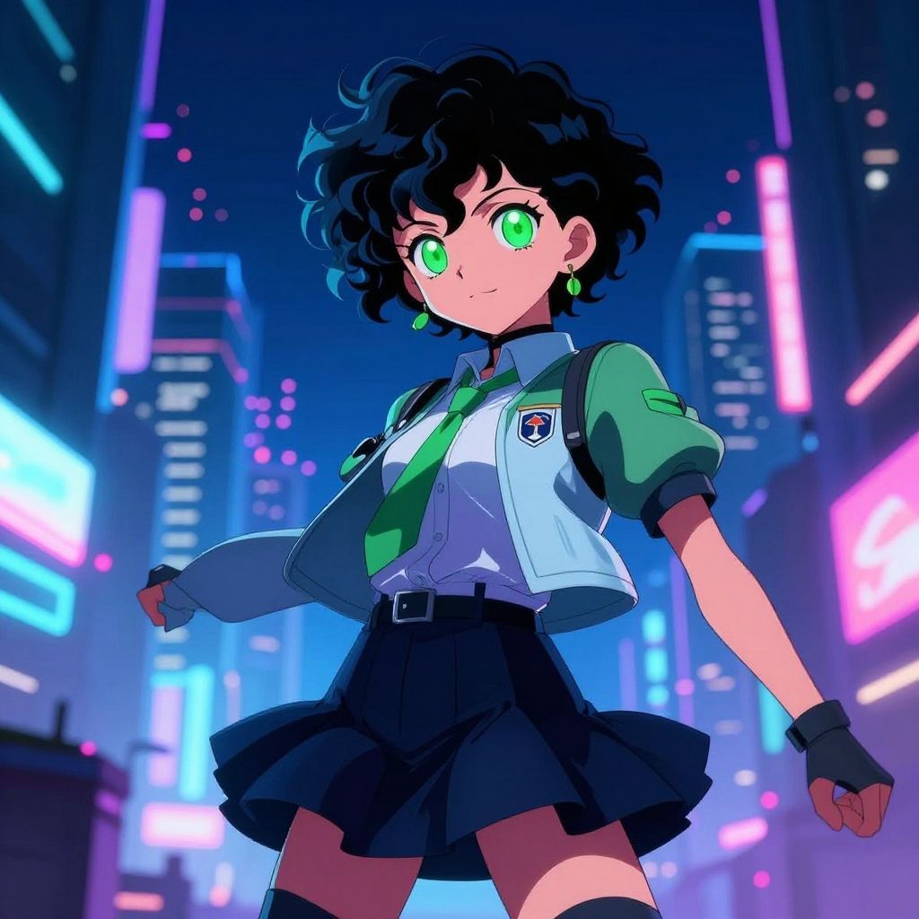 Curly haired anime character with vibrant green eyes, wearing a futuristic school uniform, standing in a neon-lit cityscape at night, dynamic pose, detailed background.