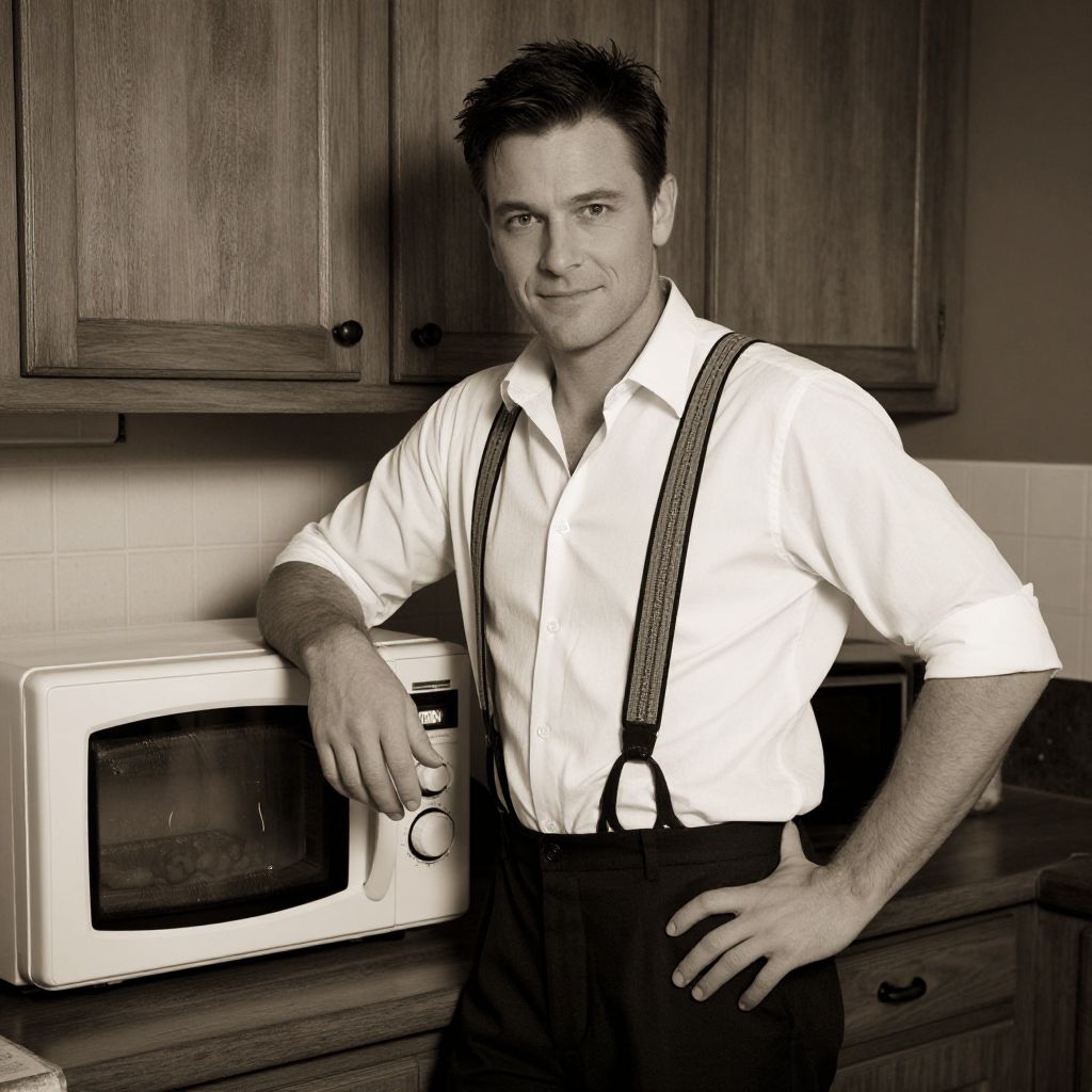A man, vintage kitchen, sepia filter, antique feel, warm tones, wearing suspenders, white shirt, rolled-up sleeves, standing by microwave, heating food, soft smile, relaxed pose, old-fashioned appliances, wooden cabinets, retro decor, cozy atmosphere, dim lighting, warm shadows Sexy. Pretty face and beаutiful eyes. Big breasts