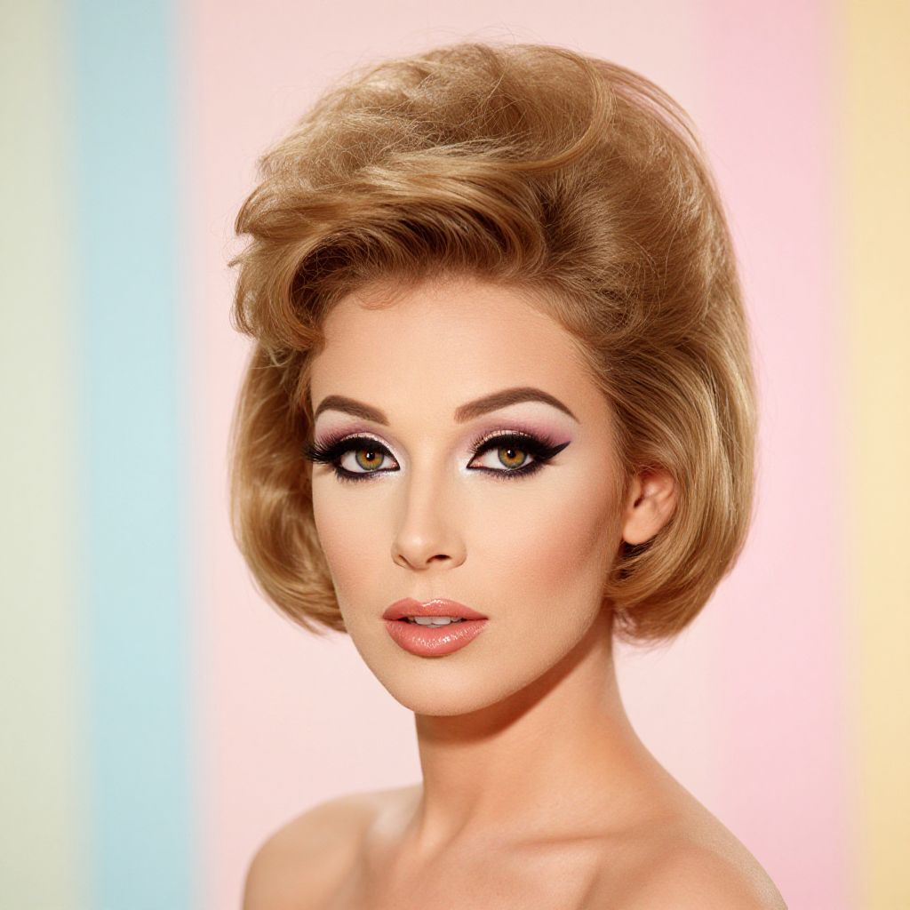60s makeup and hair inspired portrait of a woman with bold winged eyeliner, vibrant eyeshadow, voluminous bouffant hairstyle, and glossy lips, set against a pastel-colored vintage backdrop, capturing the iconic mod fashion and glamorous vibe of the 1960s.