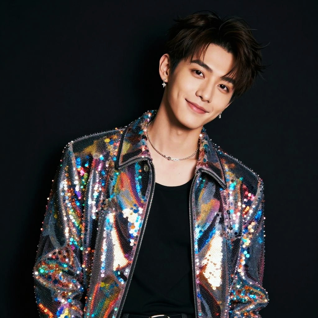 A young man poses confidently against a black background, sporting a dazzling, sequined jacket that reflects vibrant colors. His styled hair and friendly smile add to the captivating allure of this image, showcasing a modern, fashionable look perfect for entertainment or lifestyle themes.