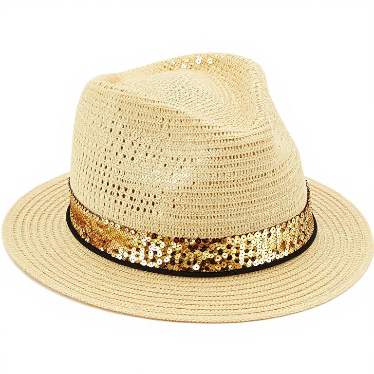 Photograph of a cream-colored, woven straw hat with a sequined brown band against a white background.