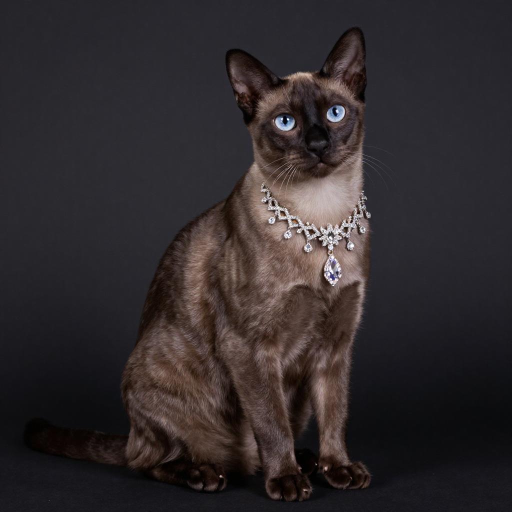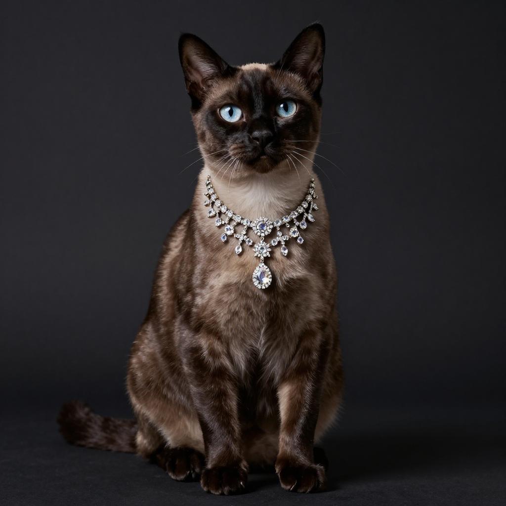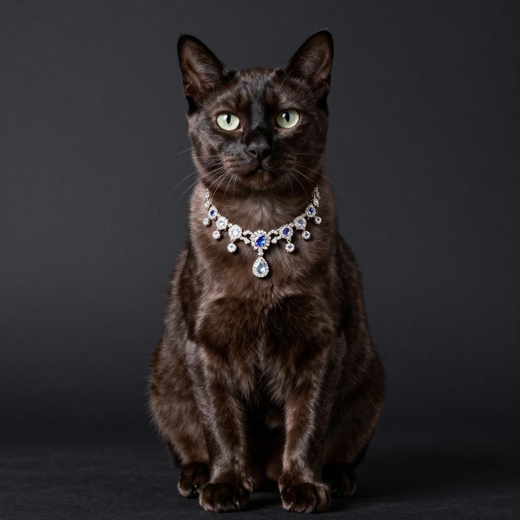 Luxurious studio portrait of a Egyptian Mau cat sitting upright, glossy dark fur, wearing an ornate sparkling diamond necklace, clean dark background with spotlight, high-end fashion pet photography, high resolution, ultra-detailed