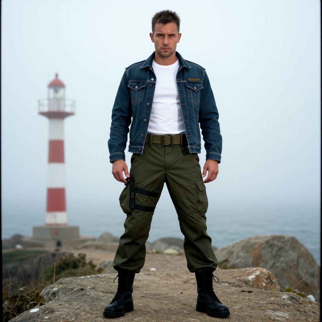 Photograph of a muscular, light-skinned man with short brown hair, standing confidently on a rocky coastal path. He wears a blue denim jacket over a white t-shirt, olive-green cargo pants, and black combat boots. His hands rest by his sides, and he gazes directly at the camera with a serious expression. In the blurred background, a red and white striped lighthouse stands tall against a foggy, overcast sky and the ocean. The path is uneven with scattered rocks and sparse vegetation. The image has a sharp foreground with a softly focused background, emphasizing the man's strong presence.