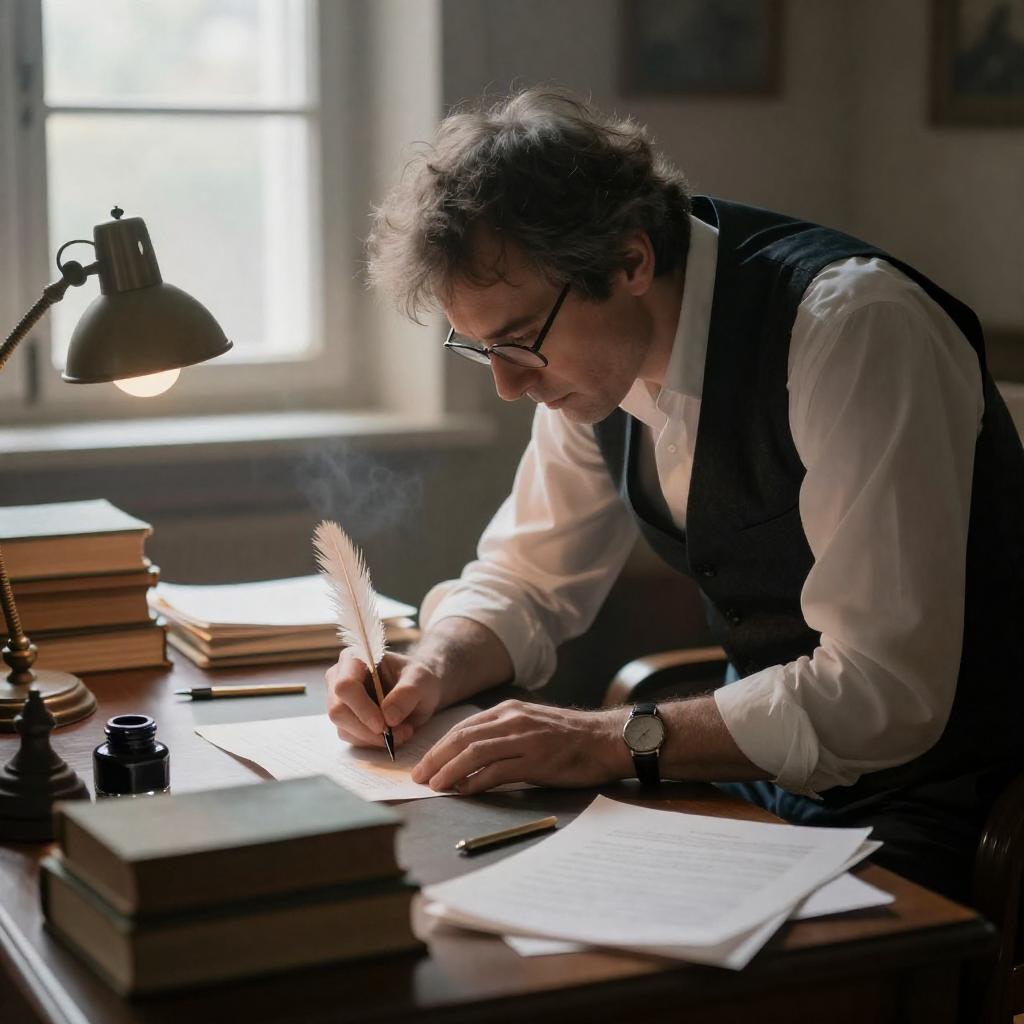 Black-and-white photograph of a bearded man with wavy hair, wearing a dark suit and bow tie, sitting and writing. His head is tilted down, concentrating. Feather quills are on the desk. Ornate chair and blurred background.