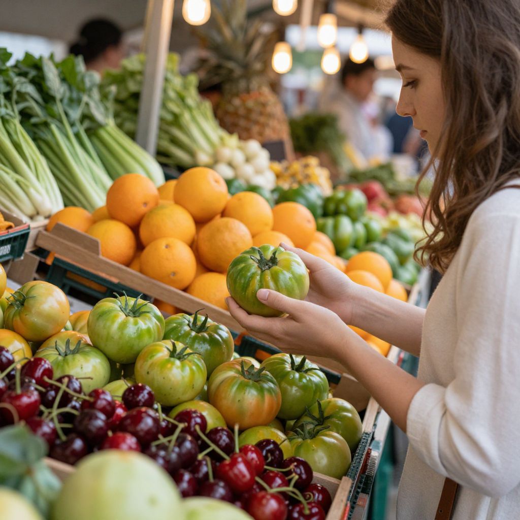 Photograph of a young woman with brown hair in a white blouse, selecting green tomatoes at a colorful market stall with oranges, cherries, and leaf