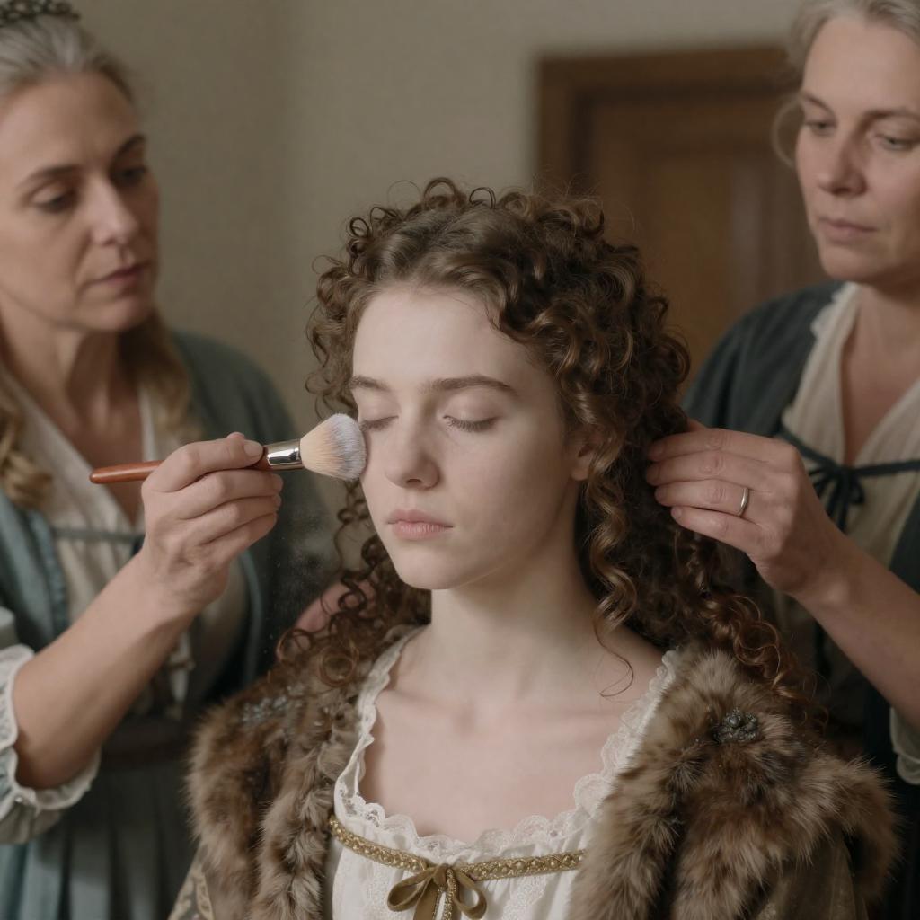 Young woman with pale skin and brown curly hair dressed in a lace collar and fur-trimmed garment, having makeup applied with a brush and hair adjusted by two older women. The setting has a vintage or historical ambiance with soft natural lighting and muted background.