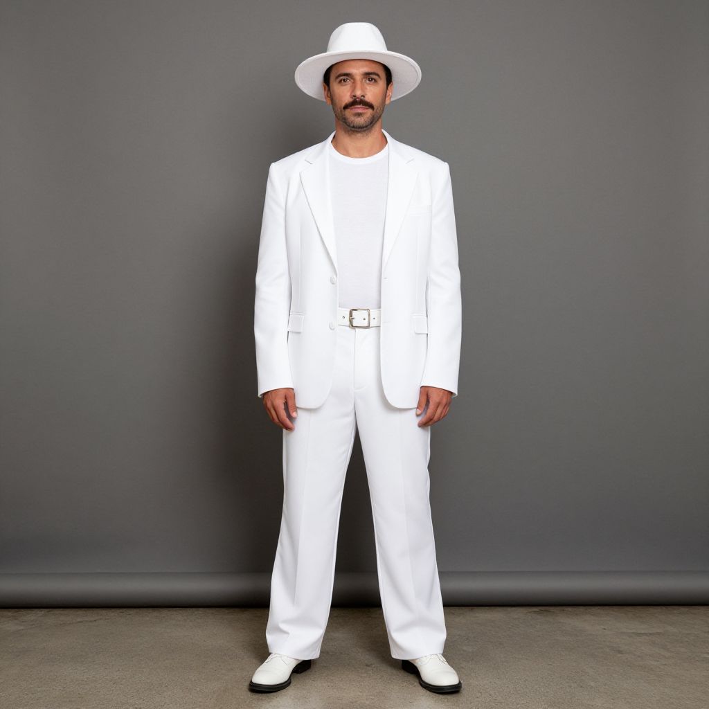 Tapatio man costume, 1boy, solo, male focus, mustache, hat, facial hair, white pants, pants, belt, standing, full body, white jacket, long sleeves, looking at viewer