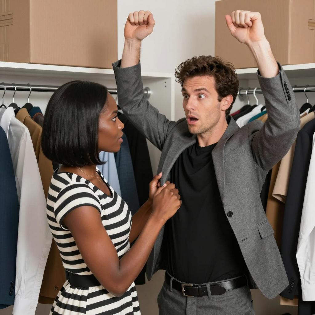 Three men pin a man with short dark hair and a red bowtie to a bed. The pinned man grimaces in pain. The man on the left wears a blue suit, the man on the right wears a brown suit with a red tie. The bed has a dark wooden headboard and a green patterned blanket. The background is pink.