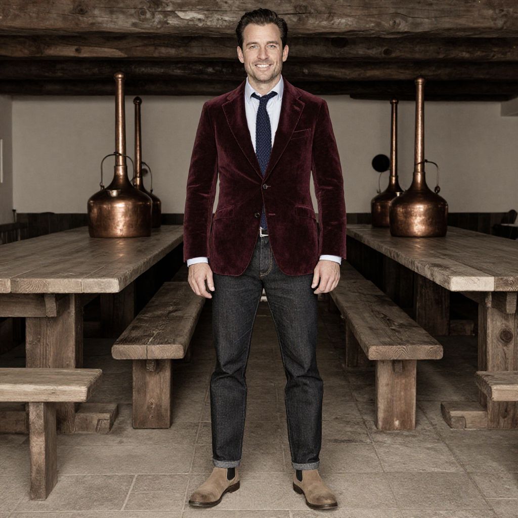 A man, burgundy velvet blazer, light blue button-up shirt, dark denim jeans, tan Chelsea boots, textured knit tie in navy, rustic wooden beams, copper brewing kettles, large communal tables, sepia effect, confident smile. Man has masculine face and piercing eyes