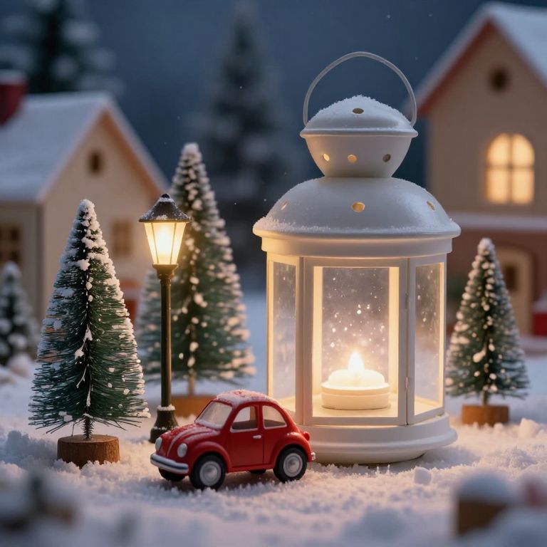 Photograph of a snowy winter scene with a glowing white lantern, red toy car, snow-covered trees, and a lit street lamp.