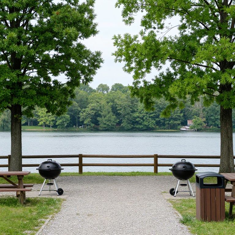 Peaceful campsite by a serene lake, featuring two charcoal grills flanking a gravel pathway, surrounded by lush green trees and a wooden railing, with a picnic table and trash bins completing the tranquil setting.