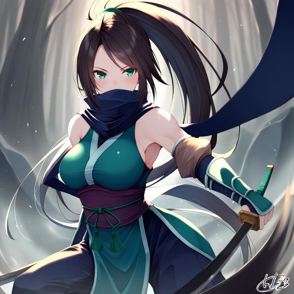 Akali (legacy), league of legends, 1girl, green eyes, black hair, brown hair, long hair, very long hair, ponytail, large breasts, ninja, by artist tsukino (nakajimaseiki), illustrious