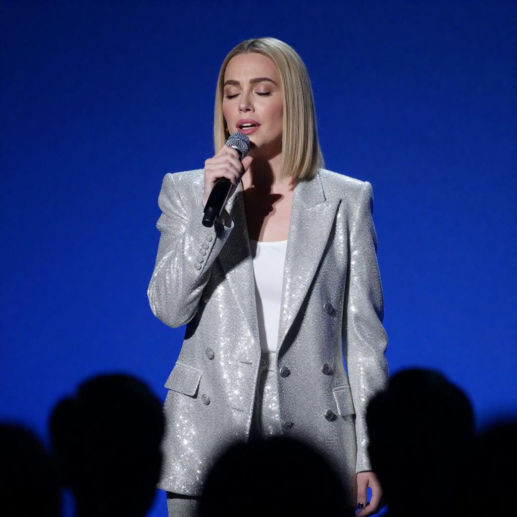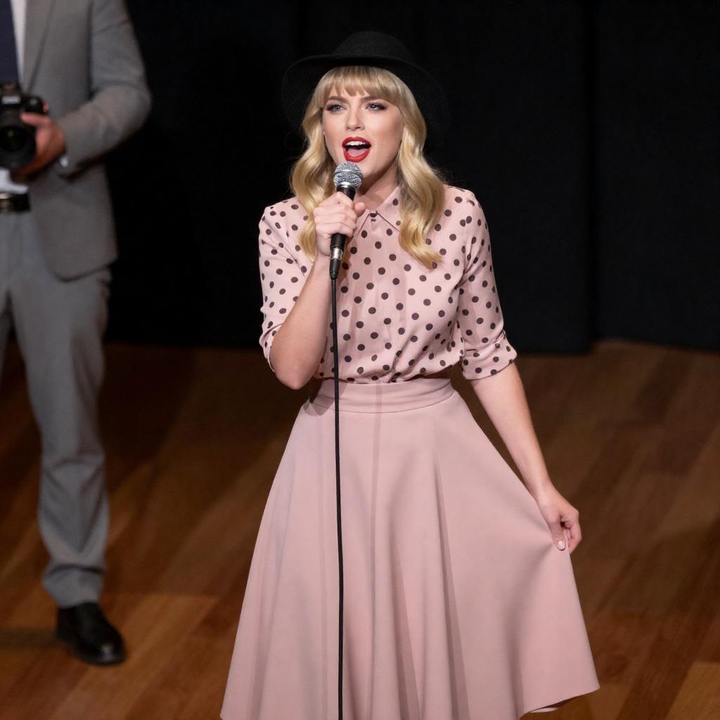 Photograph of a blonde woman with bangs, wearing a pink polka-dot blouse and high-waisted pink skirt, holding a microphone close to her mouth in an expressive pose. She has a black hat and is standing on a wooden floor in a dimly lit room. A person in a gray suit is partially visible on the left, holding a camera.