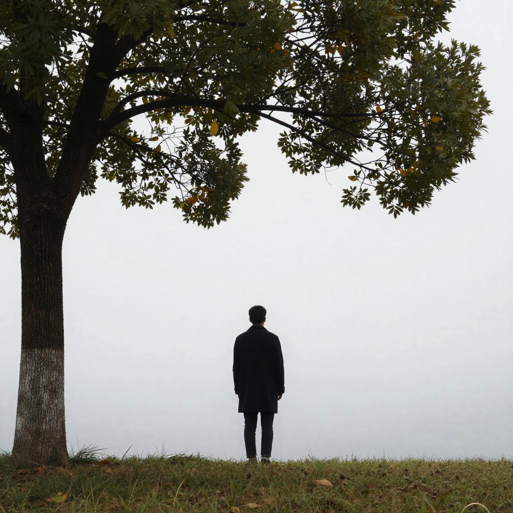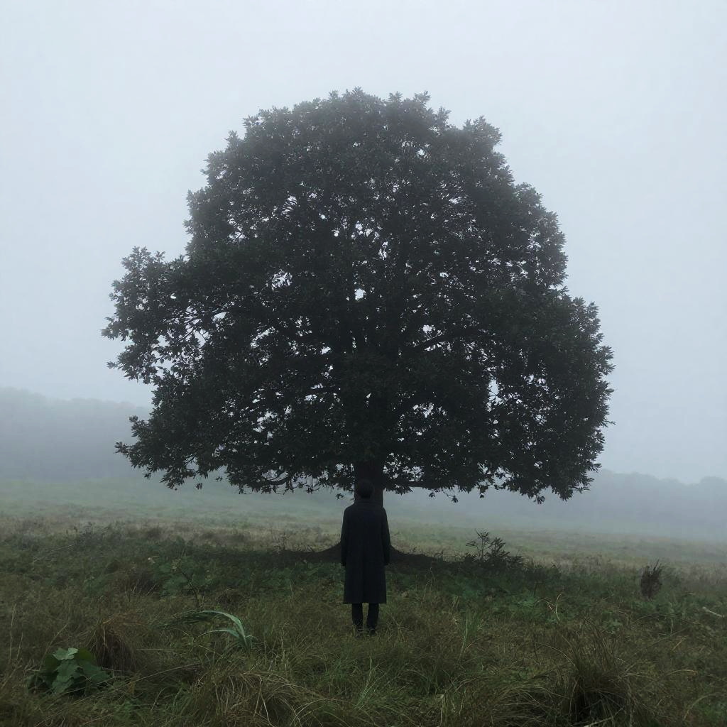Photograph of a misty landscape featuring a lone person standing in front of a large, dark tree. The person, dressed in a long, dark coat, faces away from the camera, standing on a grassy hill. The mist creates a soft, ethereal glow around the tree, making it the focal point. The overall mood is mysterious and serene.