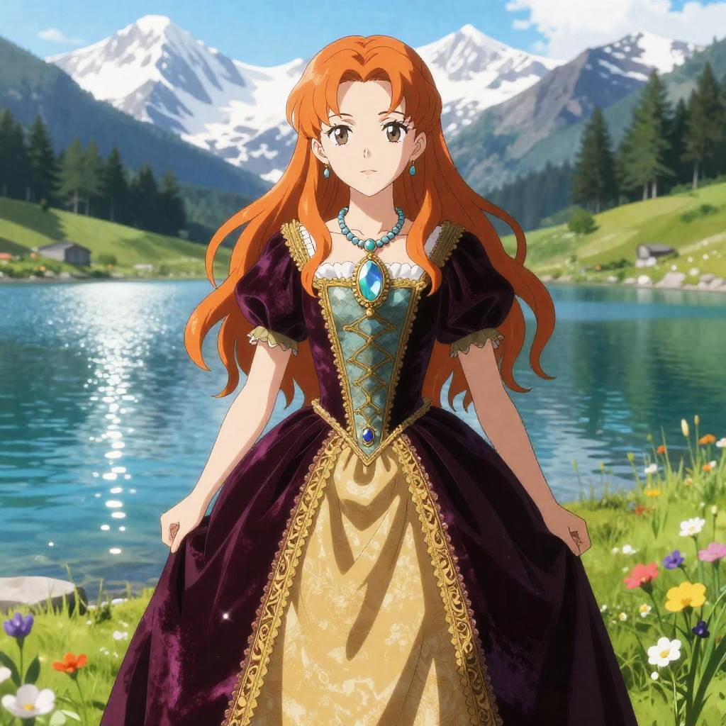 Anime style, female character, long orange hair, confident expression, large pendant necklace, intricate clothing details, vibrant colors, moonlit cherry orchard, flowing celestial hanfu with star patterns, soft silver moonlight, glimmering fireflies and blooming cherry trees