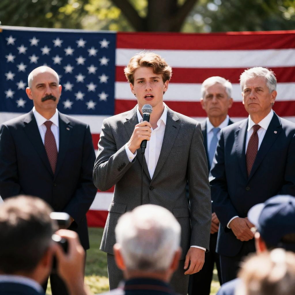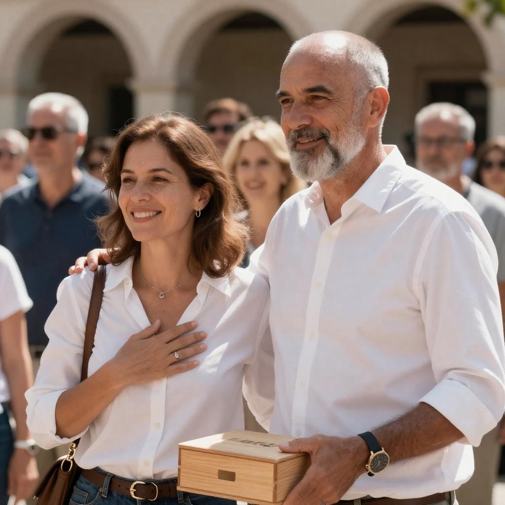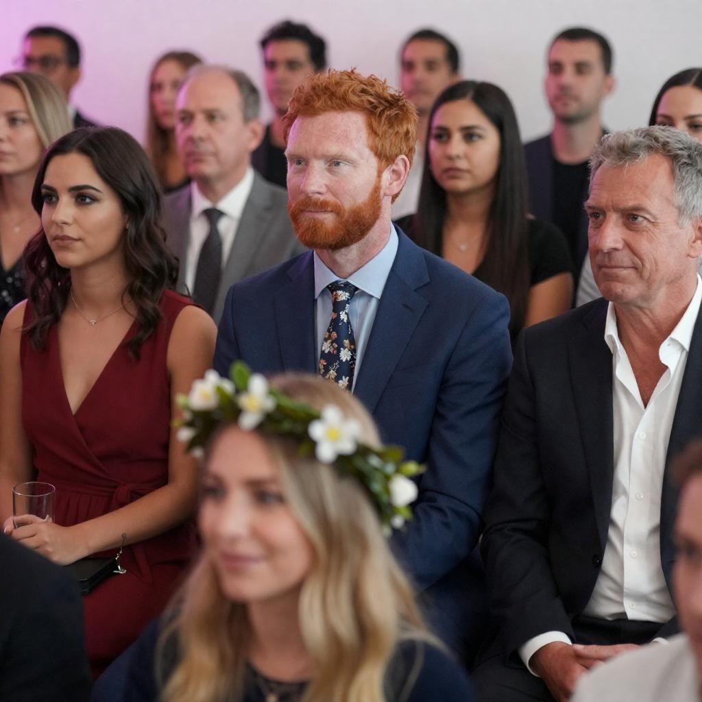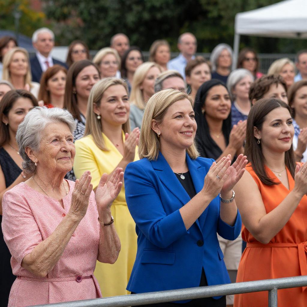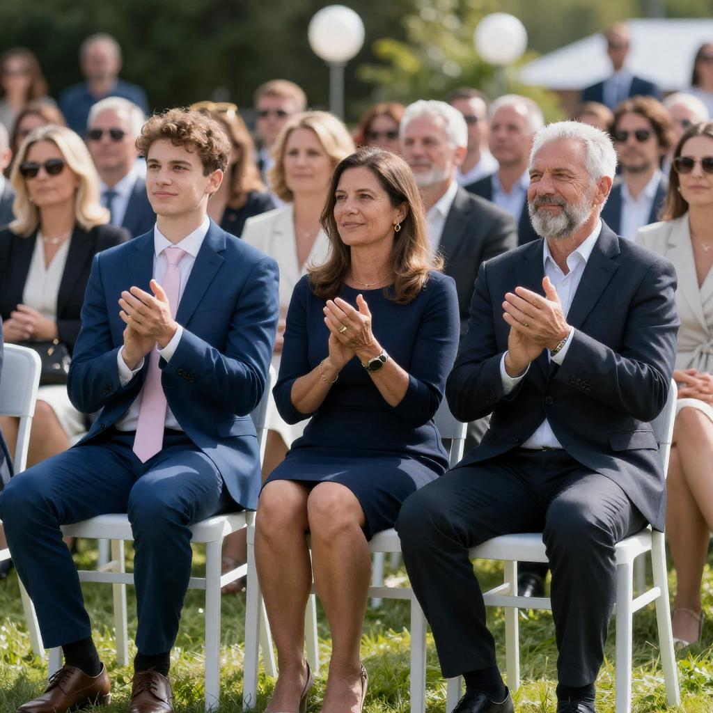 Photograph of three people seated in the front row at an outdoor event. A young man in a blue suit with a pink tie, a middle-aged woman in a navy dress, and an older man with a gray beard in a dark suit. The background shows a seated audience. The young man and older man clapping. The middle-aged woman looking forward. Bright sunlight, green grass, and white spherical lights in the background.