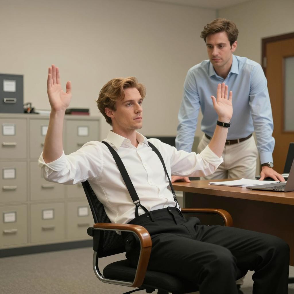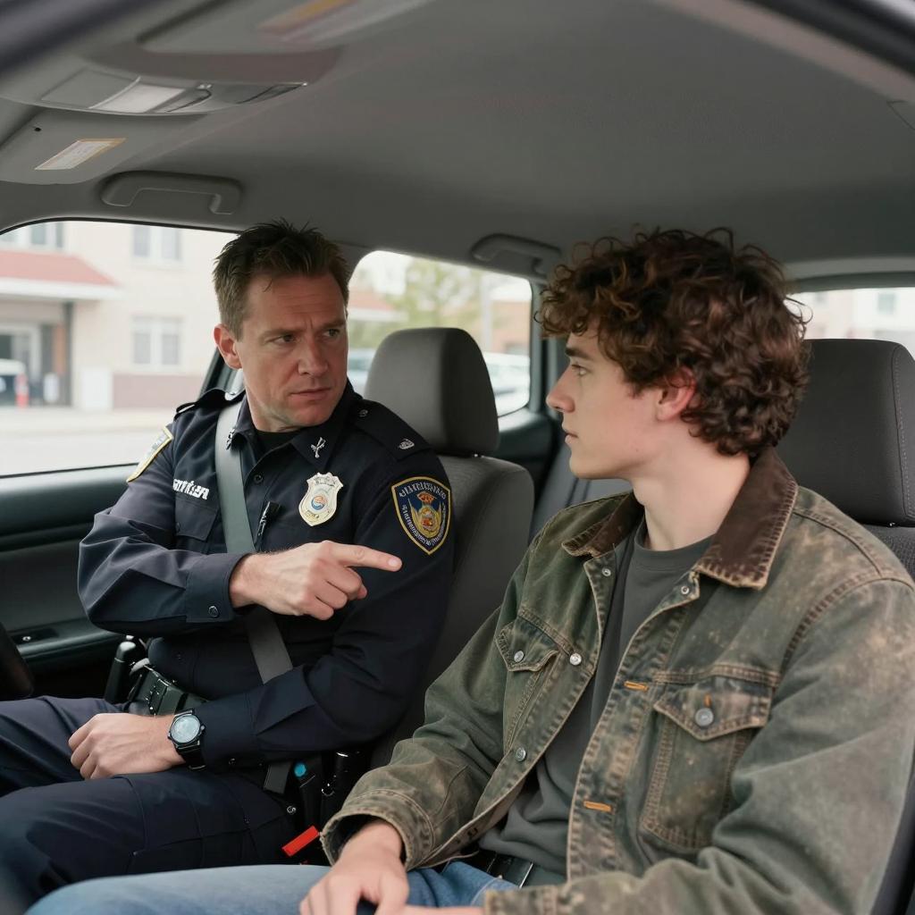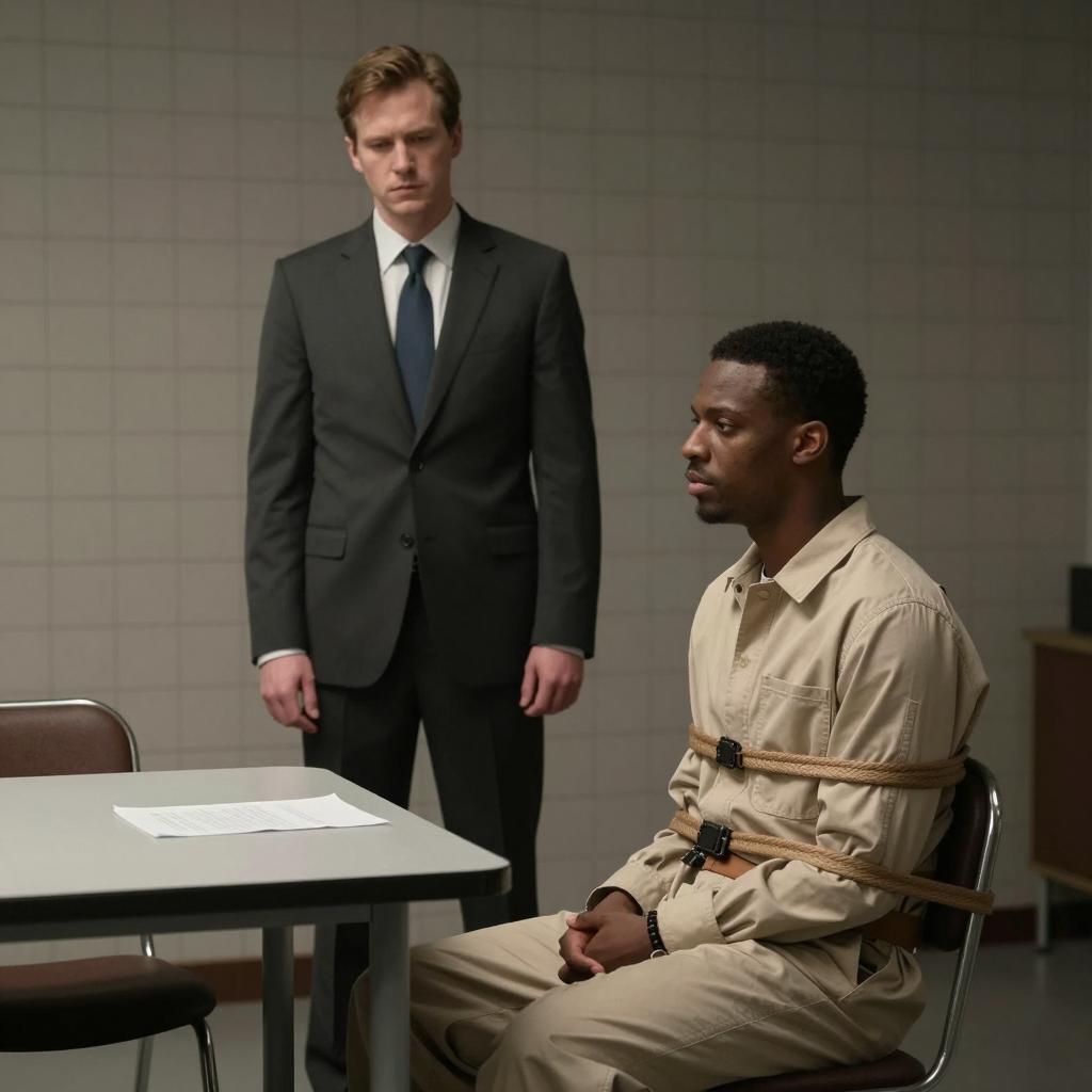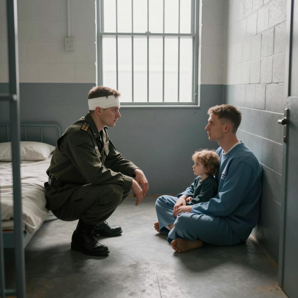 Two men in a tiled prison cell. One in a police uniform with a bandaged head, sitting against the wall, legs crossed. The other, crouching, barefoot, wearing gray prison clothes, near a metal bed. Sunlight casts shadows on the floor. Window with wire mesh in the background.