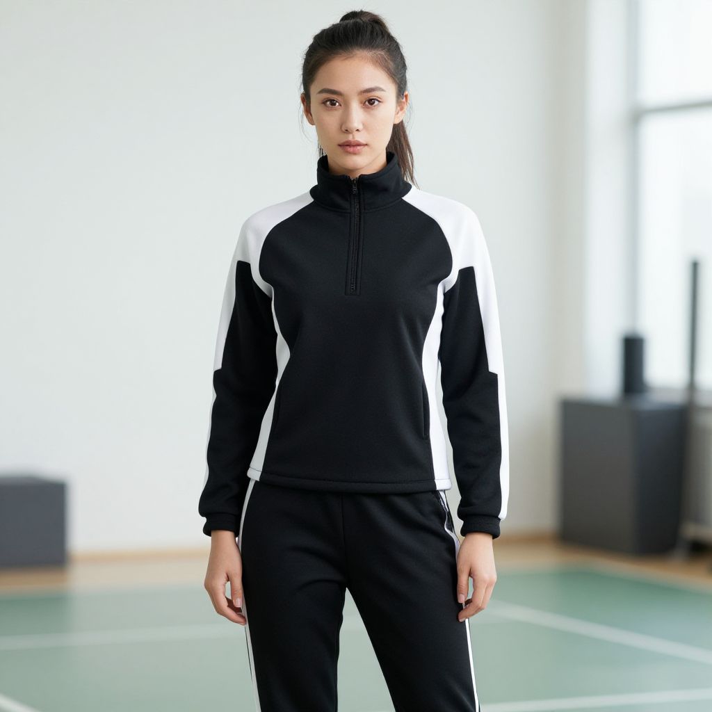 The image features a stylish young woman wearing a contemporary black and white tracksuit, embodying a sporty yet fashionable look. Set in an indoor sports facility, she exudes confidence and athleticism, making it perfect for fitness and active lifestyle themes.